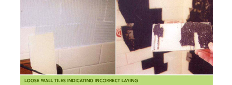 • Excess water penetrating behind the tile can break down some tile adhesives. This will result in failure of the adhesive if this occurs for a prolonged period of time. The first indication of this will be the drummy sound of the tiles.